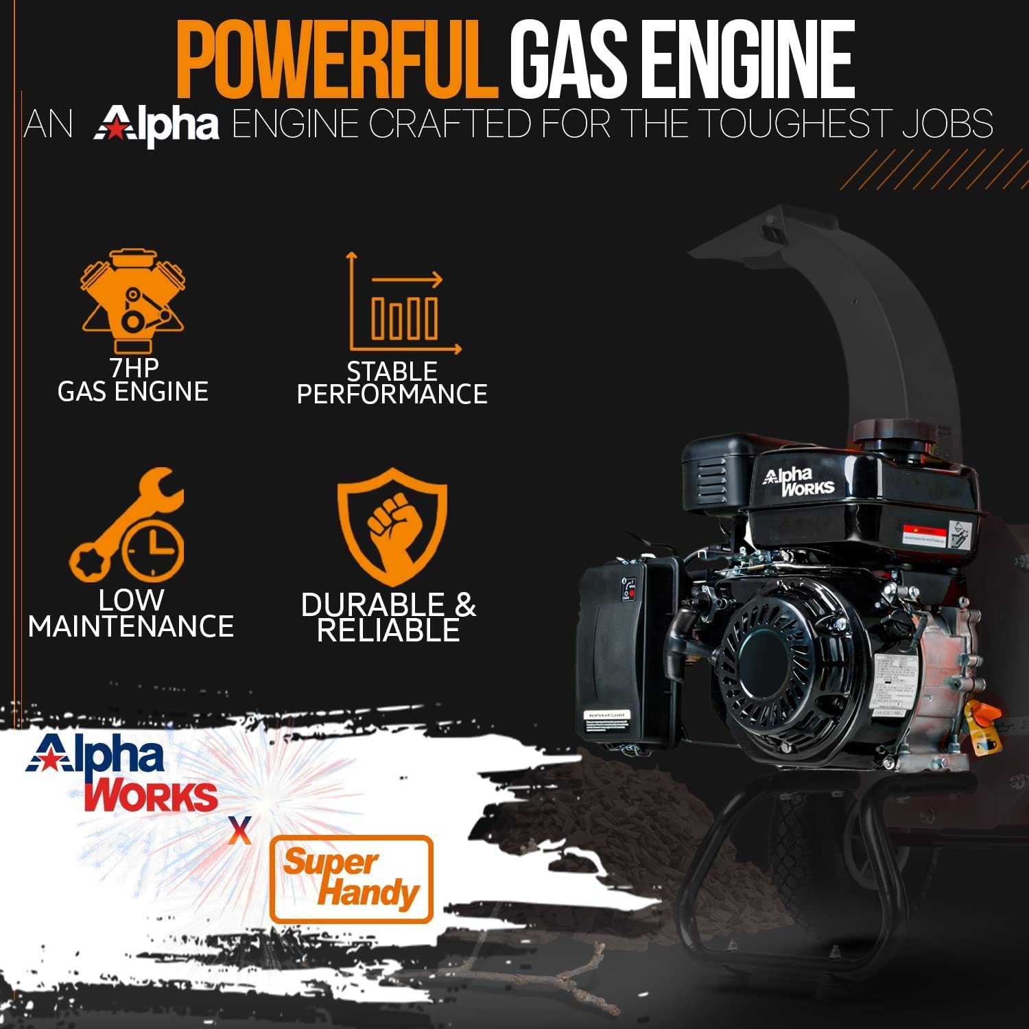 Our Super Handy compact wood chipper and shredder comes with an extra large hopper for max volume. Easily chip and shred up to 3″ branches and limbs. Mulch all your bark, branches, limbs, and leaves with a reduction ratio of 15:1. Utilize an elongated top adjustable discharge chute for versatility in the disposal.Â